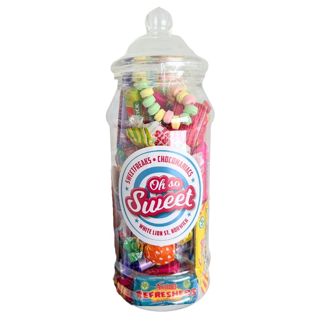 Presented in a sturdy, reusable PET plastic jar, it’s not only filled with colourful retro sweets – it’s also perfect for refilling, storing snacks, or keeping around as a fun decorative piece.